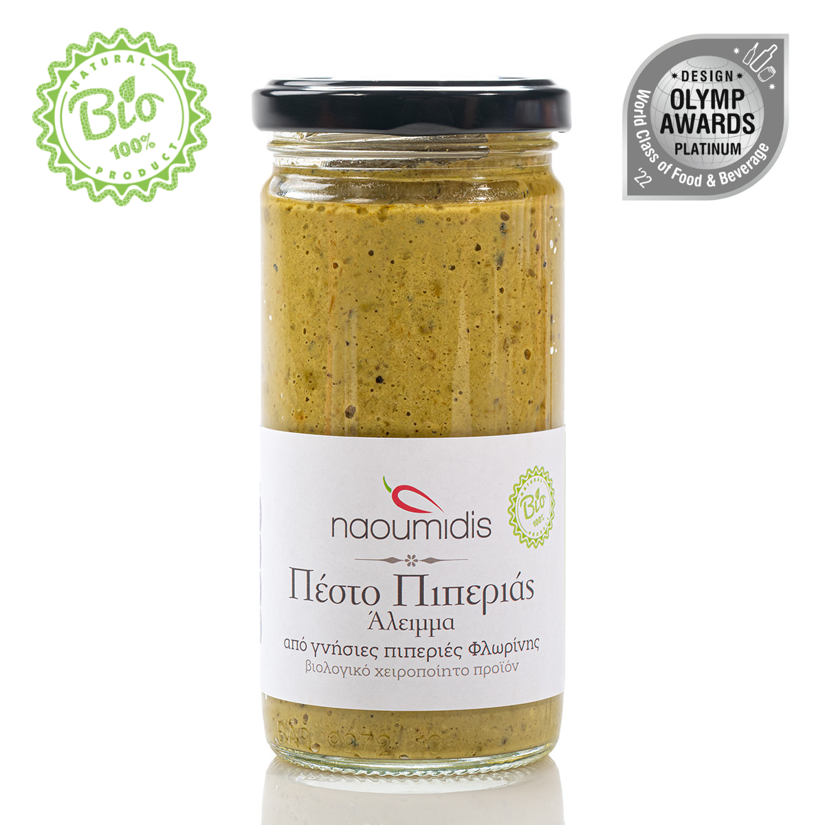 100% real green Florina pepper grilled on coals, basil, wild garlic, pine nuts, sunflower seeds, salt, lemon, extra virgin olive oil. Peeled by hand to retain the aromas of the natural pepper. A 260g jar. it contains about 3 kg of fresh peppers and is cooked for 3 hours in order to concentrate the peppers. Handmade product of organic farming. Pasteurized, no preservatives. Serve hot or cold as an appetizer, on pasta or rice, as a dip, as a spread on sandwiches or pastries. Glass packing 260gr.