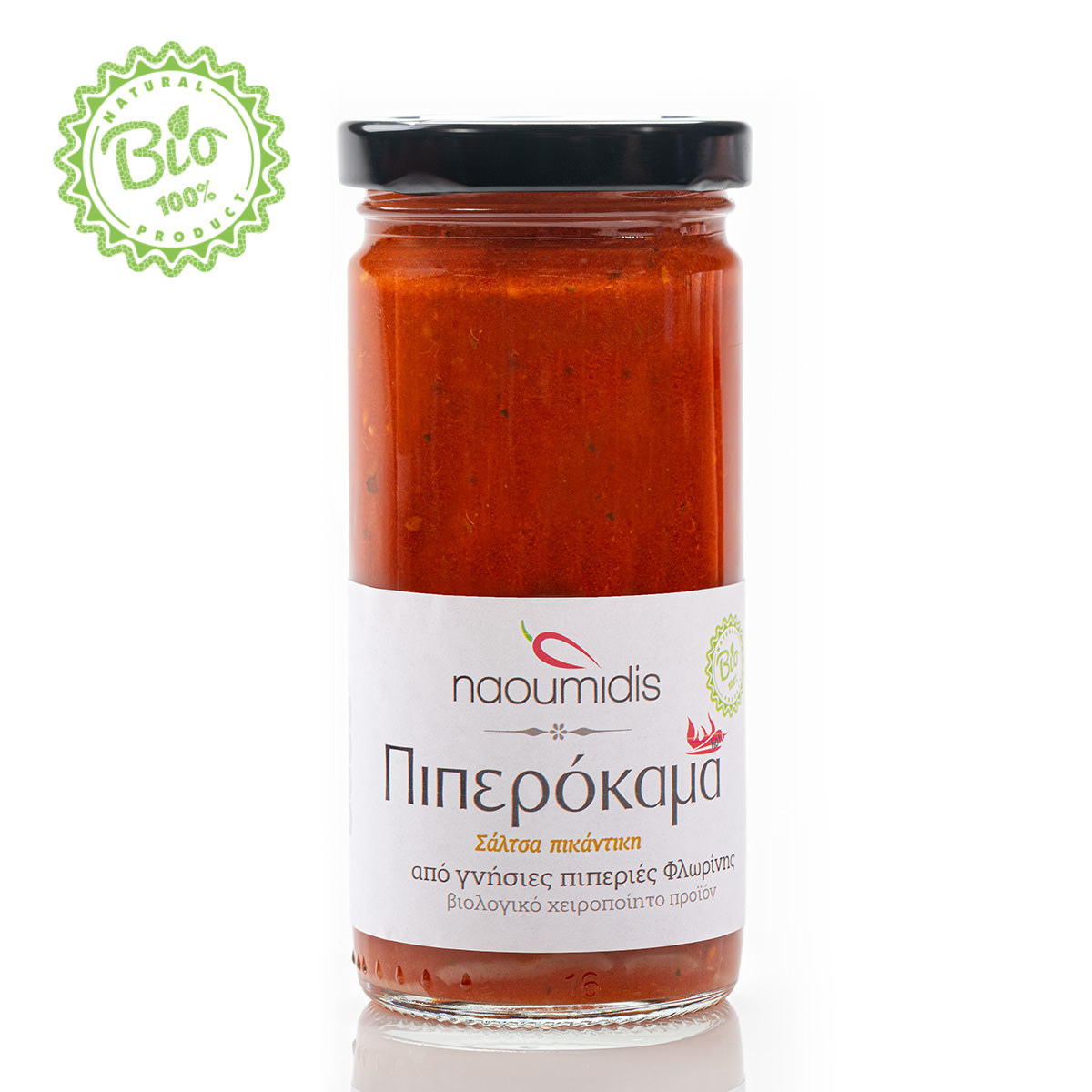 Red hot authentic Florin pepper, tomato, onion, wild garlic, thyme, salt, pepper, spices, paprika, extra virgin olive oil, vinegar and must (petimezi) from 100% black and sour grapes.. Contains traces of celery. May contain traces of sulfites. Handmade product of organic farming. Contains traces of celery. Pasteurized, no preservatives. Sauce ready to use. It is served over pasta or rice, as a cold or hot appetizer, as a dip, as a spread on bread, in sauces, as an accompaniment to food. Perfect for pizza. Glass 260 packgr.